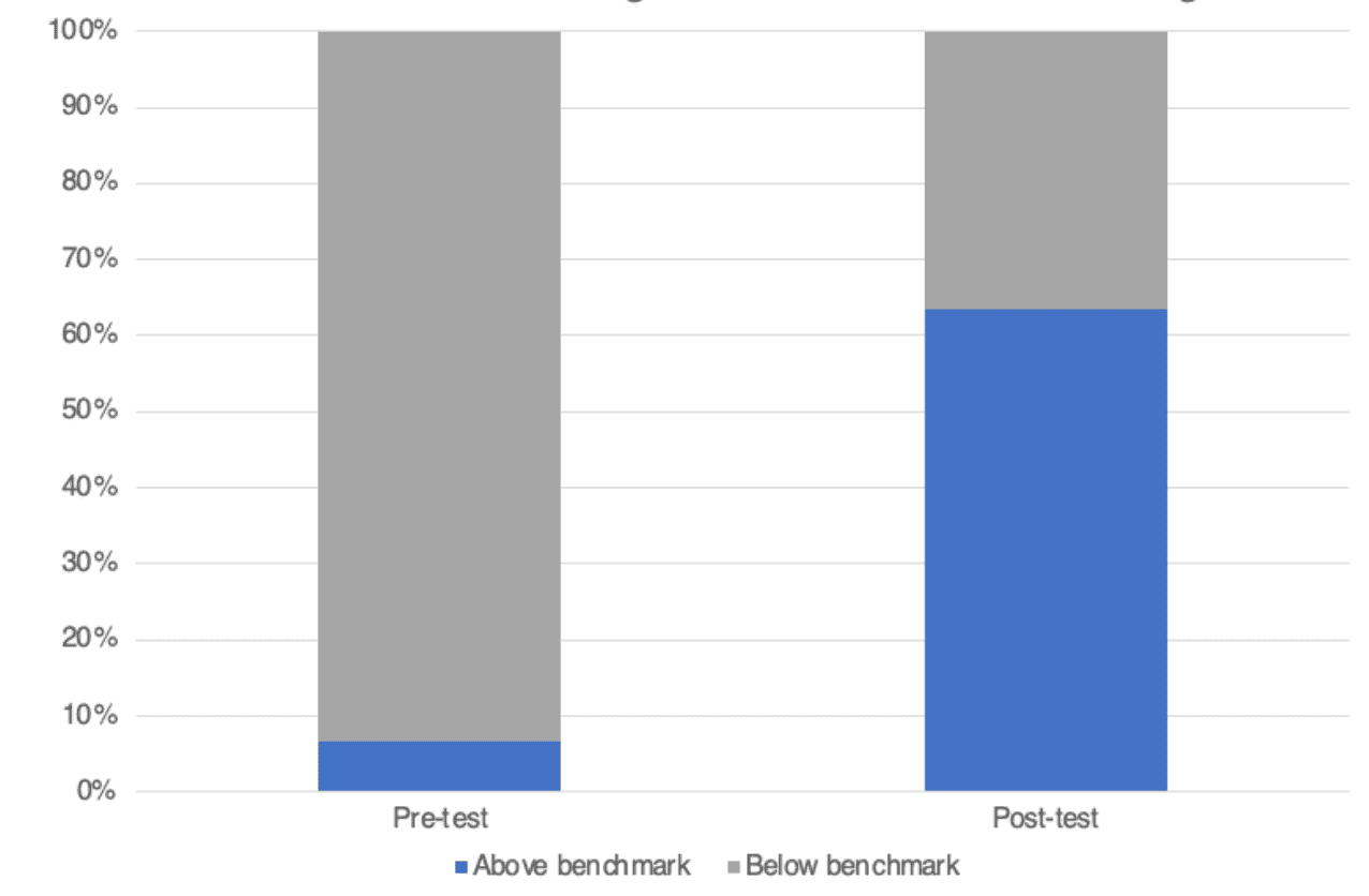 The innovation resulted in significant improvements in writing proficiency. Test results showed that the proportion of students achieving above benchmark levels in creative writing increased from below 10 % to over 60 % by the end of implementation.